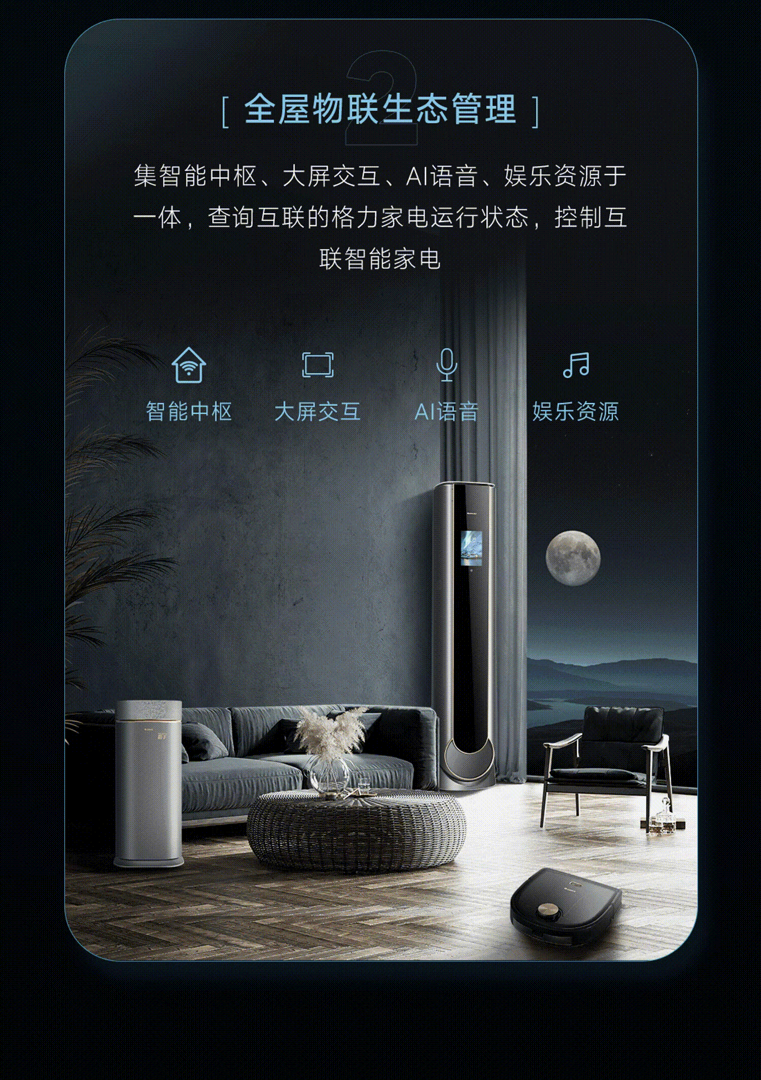 格力·至尊 格力旗舰空调 格力·至尊家庭智生态中心,一机多能,融合全屋气候与物联管理,集温、风、湿、净、鲜五维气候控制,缔造全屋宜居环境,享受自然又自在的生活体验